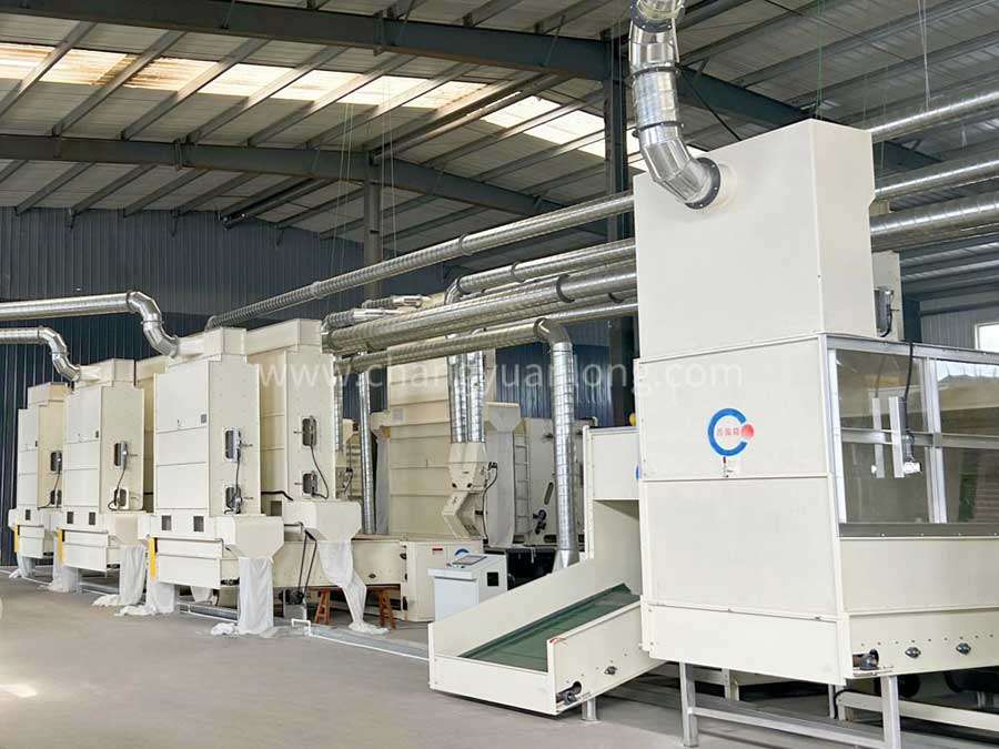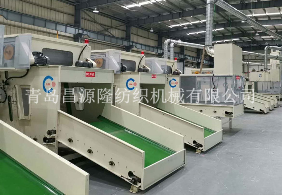 1. CYKB-1200 開(kāi)包(bāo)機(jī):開鬆各種捆包纖維,按比例(lì)由(yóu)電子秤進行稱量,均勻平鋪在混棉簾上。各種不同纖維被放入水平輸送簾,經壓棉輥和對輥羅(luó)拉喂入,經(jīng)高速打手(shǒu)開鬆後由輸棉風機送到下(xià)道工序。