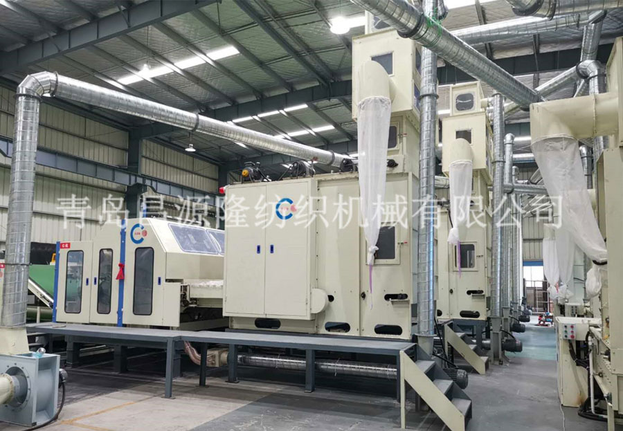 4. CYLSL-2000梳理機:該機為單(dān)錫林(lín)、雙道夫、四雜亂、羅(luó)拉剝取。該機所有輥筒都經調質和定性(xìng)處理後,再精密加工。牆板由鑄鐵加工而(ér)成,針(zhēn)布采用國(guó)產優質針布,並配有吸風裝置,可減少清機次數,還帶有走台。具有分梳(shū)能力強,產量高(gāo)等優點。