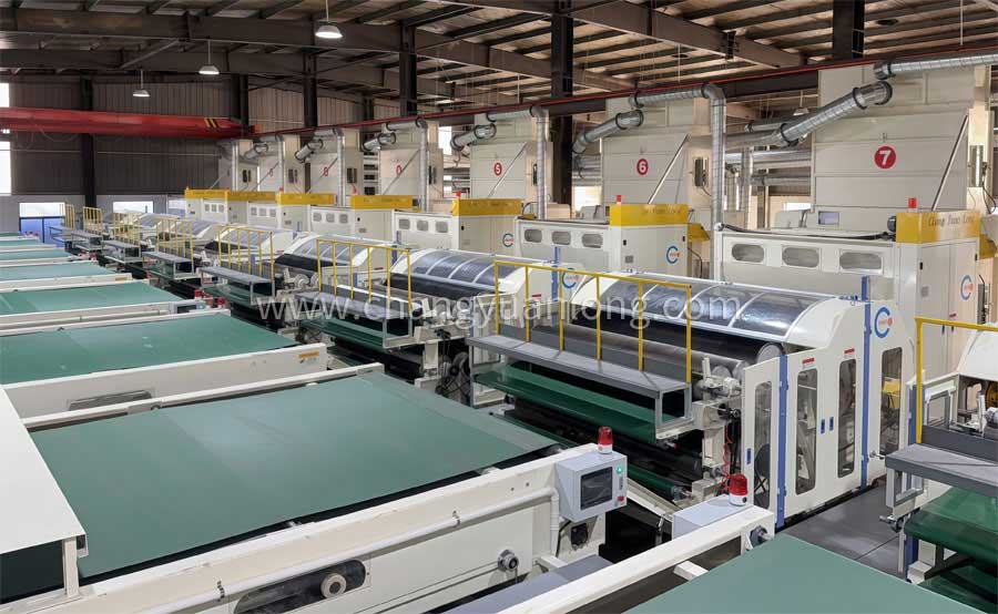 生產線用途:該機組(zǔ)主要生(shēng)產(chǎn)高彈噴膠棉、仿絲棉。 該產品廣泛應用(yòng)於服裝、床(chuáng)上用品、家具等。根據客戶要求可分(fèn)四機頭、六機頭、七機頭等(děng)。機頭越多,產量越高。