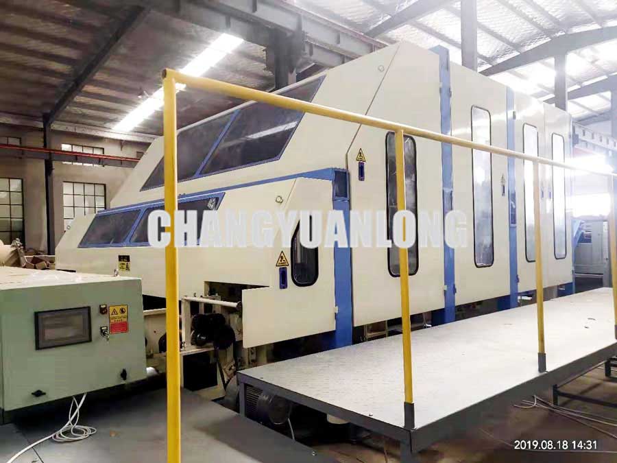 本機為雙錫林、雙道夫、雙雜亂梳理機。它適用於經過開鬆後的化學纖(xiān)維,進一步開鬆混合(hé),再經過雙錫林、雙道夫、雙雜亂、羅拉剝取,將纖維精梳成均勻(yún)偏差較(jiào)小的、具(jù)有一定雜亂比的纖維網,供下(xià)一(yī)道工序使(shǐ)用(yòng)。