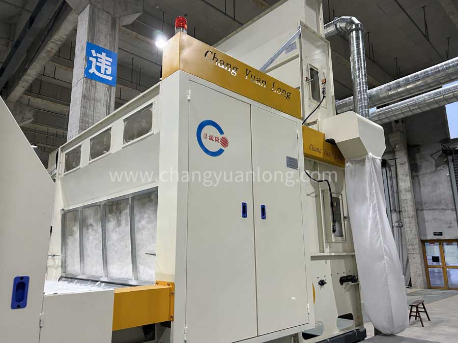 經充分開鬆除雜質(zhì)的(de)各種不(bú)同纖維經輸(shū)棉(mián)管道(dào)送入棉箱,經充分混合角釘簾輸送,由輸棉道及振動(dòng)板連(lián)續均勻輸出(chū),由(yóu)光電定量控製。