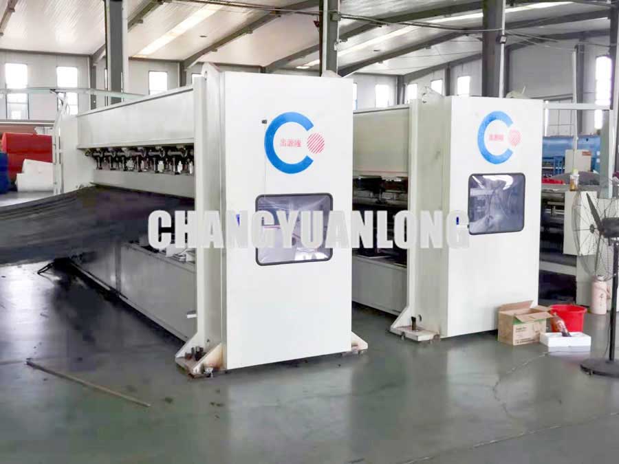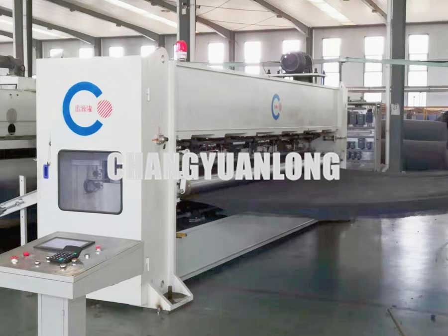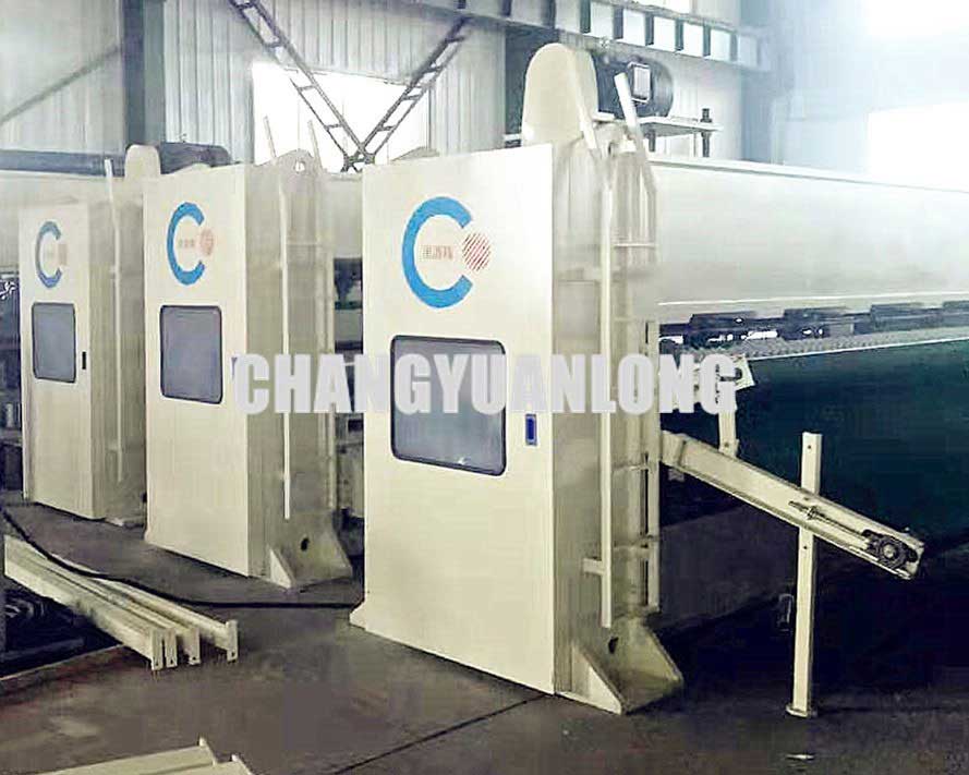 鋪網機將鋪好(hǎo)的棉網喂入針刺區,針刺(cì)機對蓬鬆棉網進行(háng)初加工;由一對輥組成的輸(shū)出機構(gòu)將初步針(zhēn)刺的棉網輸出,